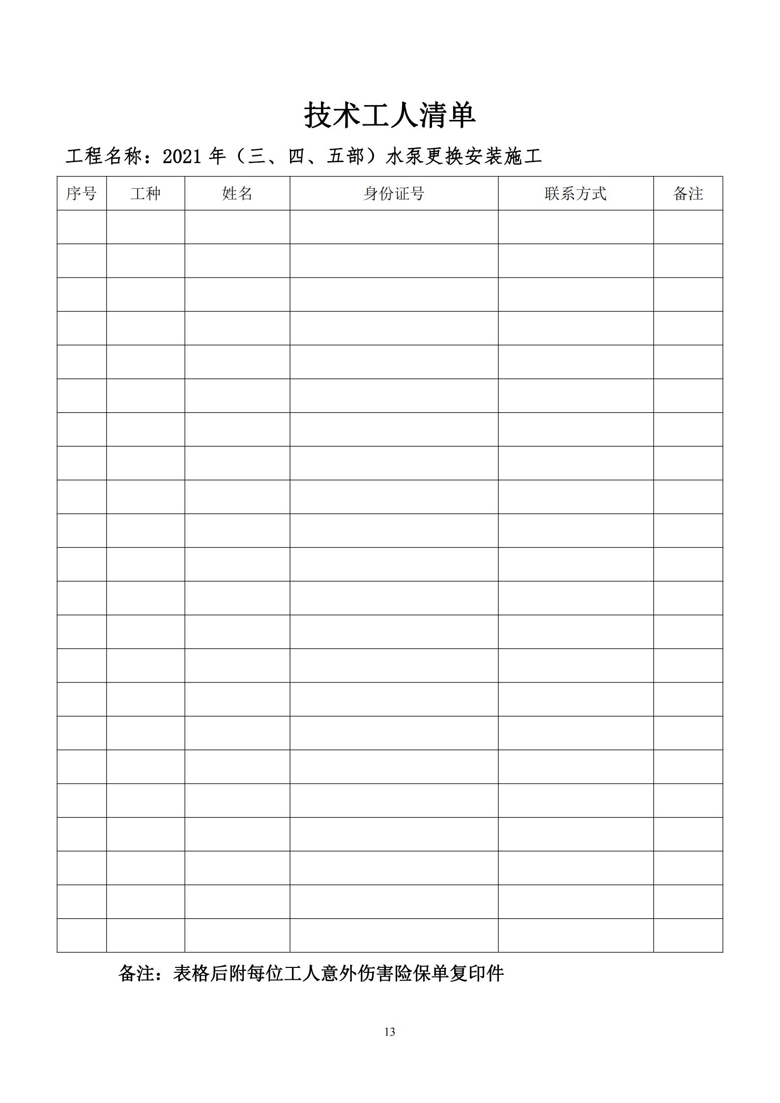 1.供應商根據采購人提供的資料及自行勘查現場情況,規(guī)范并完整填寫《2021年(三、四、五部)水泵安裝施工工程量清單》、《工程報價書》、《技術工人清單》,填寫后放入信封中,信封密封并在密封處加蓋公章,在信封上書寫單位名稱。其中:《工程報價書》在單位名稱處蓋公章,《2021年(三、四、五部)水泵安裝施工工程量清單》、《技術工人清單》填寫完整后分別加蓋公章。未按要求提交投標資料的取消參加資格。供應商參加詢比采購會議時,將2021年(三、四、五部)水泵安裝施工工程量清單、報價書、技術工人清單交與采購人現場人員。